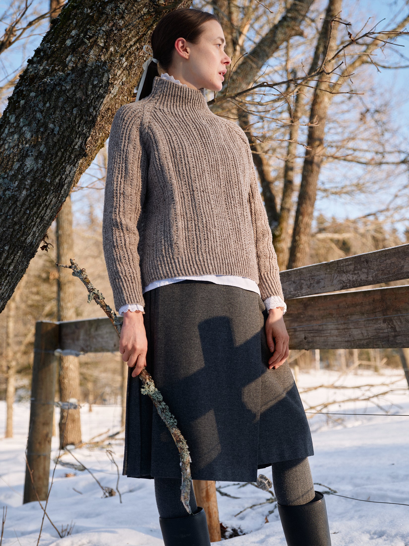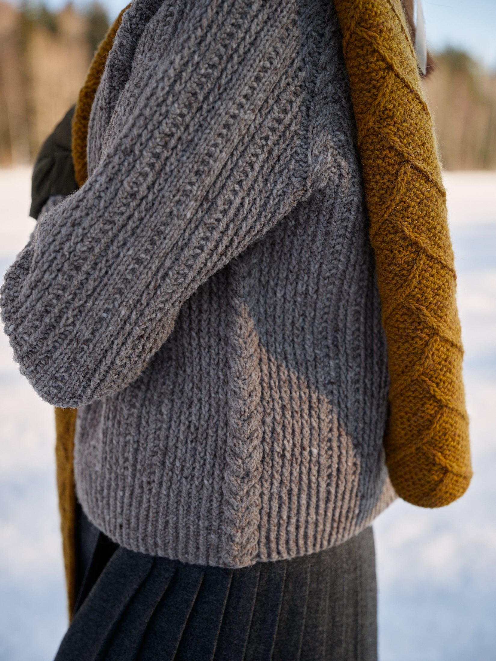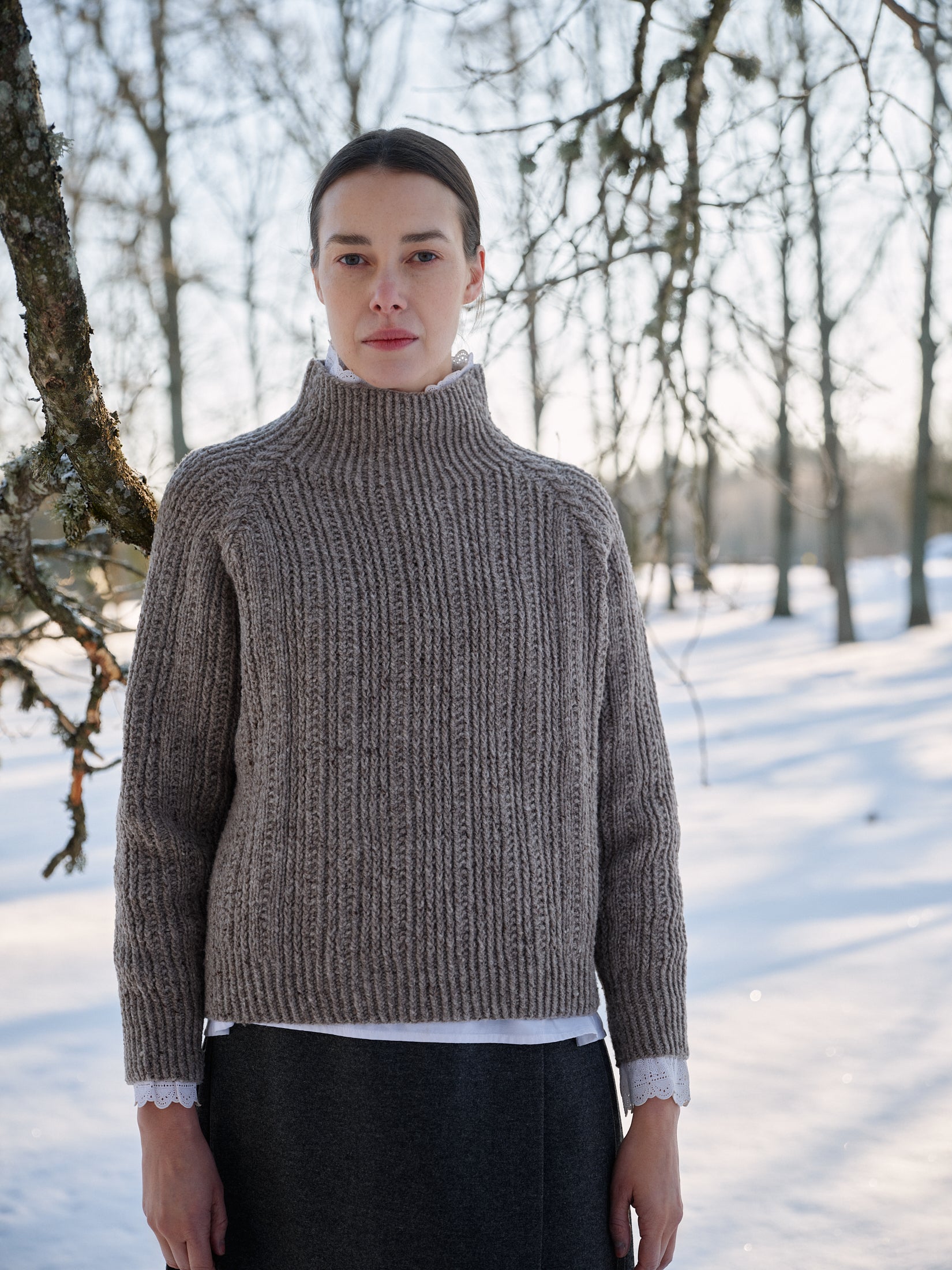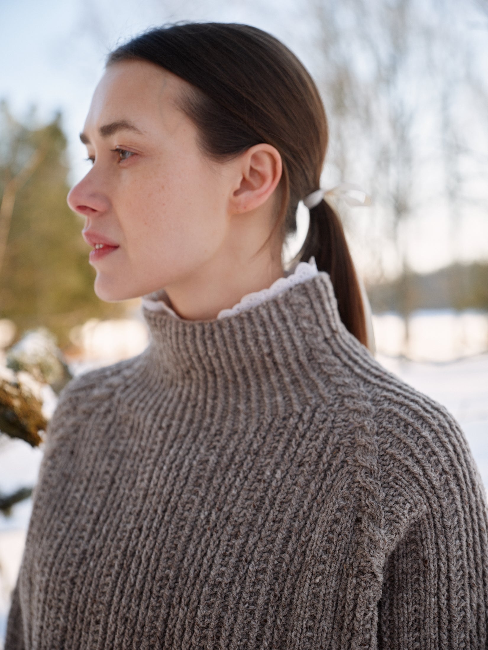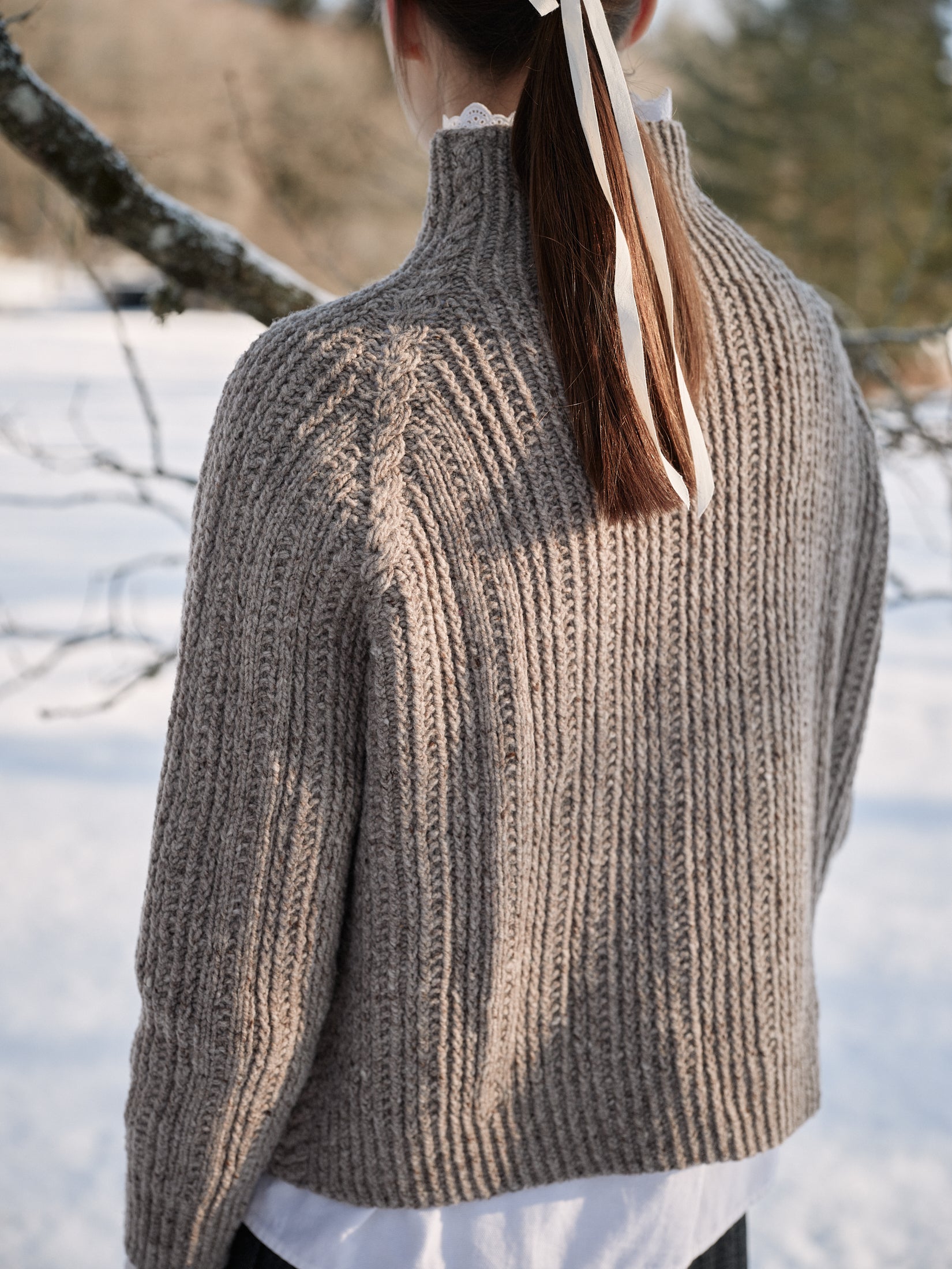このセーターは, ボトムアップで編み進める. まず両方の袖を編み, その後に身頃を編む. 次に袖と身頃をつなぎ合わせ, ヨーク部分はケーブル編みのラグランラインに沿って減目しながら編み進める. 襟下がりは German Short-rowで作り, 襟はねじりリブとケーブル模様の組み合わせで仕上げる.
